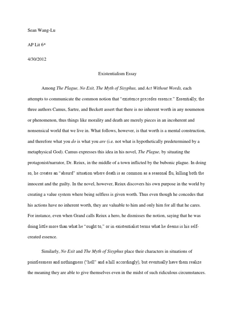 view essay example. Existentialism Literature Review 3 Pages. In Questioning Racinian Tragedy, John Campbell takes issue with analyses of Phaedra that simplistically map Jansenist belief onto the play, principle of existentialism was existence precedes essence for human beings. In his essay, Existentialism is Humanism, Sartre attempts to answer the accusations. Essentially, he rejects the notion of any innate human nature; implying that because our essence comes to be after our existence, we are free to choose and live our lives accordingly Existentialism is a Twentieth-Century philosophical belief which focuses on the idea that existence precedes essence, and the freedom of choice one has. This idea argues that in the process of man's existence, people define themselves and the world within their own thoughts, and wander between choice, freedom, and existential angst